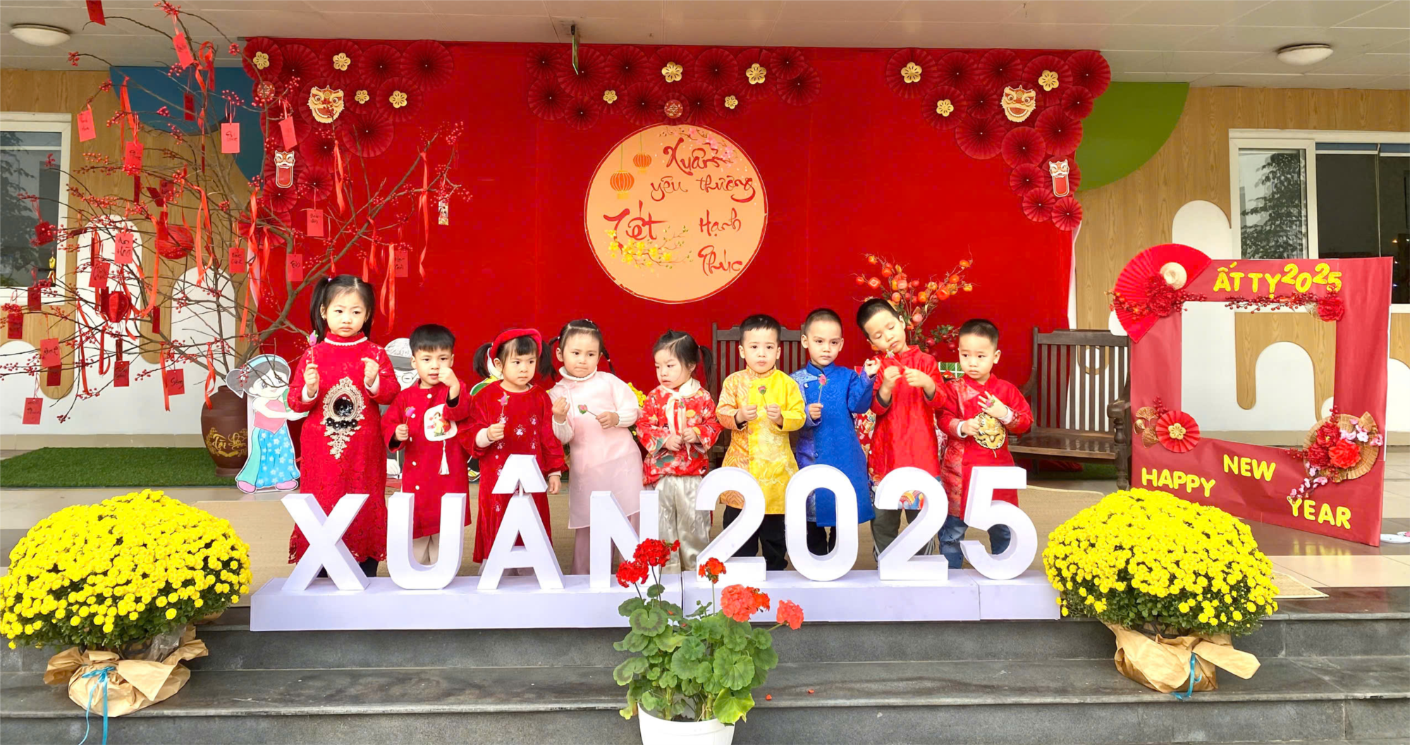 Khi những cành mai, cành đào nở rộ cũng là lúc báo hiệu ngày Tết đến xuân về. Đó là ngày Tết cổ truyền của dân tộc Việt Nam chúng ta. Việc cho trẻ được trải nghiệm một không gian Tết cổ truyền ngay tại trường học là hoạt động thiết thực, giúp trẻ hiểu hơn, yêu hơn và có ý thức giữ gìn nét đẹp văn hóa của dân tộc. Chính vì vậy, mỗi dịp Tết đến, Xuân về. Trường mầm non Gia Thượng lại tổ chức các hoạt động cho trẻ trải nghiệm một không gian Tết cổ truyền ngay tại trường học, đây là hoạt động thiết thực, giúp trẻ hiểu về ý nghĩa của ngày Tết nguyên đán, giúp trẻ yêu hơn và có ý thức giữ gìn nét đẹp văn hóa của dân tộc . Tại lớp mẫu giáo bé C3 cô giáo đã tổ chức cho các bé khám phá chủ đề Tết thông qua các hoạt động giáo dục như: Hoạt động học vẽ, nặn quả thanh long, làm tranh hoa mùa xuân, hoạt động trải nghiệm ngoài trời, hoạt động góc, tô màu tranh thư pháp, hoạt động chiều và các hoạt động chuẩn bị đón Tết khác. Với sự hướng dẫn gợi mở của cô, các bé được sáng tạo, thể hiện sự khéo léo của đôi bàn tay và tình cảm của mình với ngày Tết cổ truyền qua việc trang trí cây mai, cây đào cho thật đẹp, bày biện sắp xếp bánh trưng, mâm ngũ quả. Những chậu hoa rực rỡ được trang trí dọc khắp hành lang và sân trường. Các bé vô cùng hào hứng, thích thú khi được thể hiện năng khiếu ca hát của mình trong “Lễ hội mùa xuân” khi cô giáo tổ chức vui liên hoan văn nghệ cuối tuần. Có thể nói việc tổ chức các hoạt động cho trẻ khám phá, trải nghiệm về ngày Tết nguyên đán, đã phần nào giúp các bé hiểu được những nét đặc trưng trong phong tục truyền thống của ngày Tết cổ truyền Việt Nam. Từ đó, giáo dục trẻ lòng tự hào, yêu mến về truyền thống văn hóa Việt Nam cũng như biết giữ gìn phong tục truyền thống trong ngày Tết cổ truyền. Dưới đây là 1 số hình ảnh cô và trẻ lớp mẫu giáo bé C3 tham gia trang tri đón Xuân năm 2025: