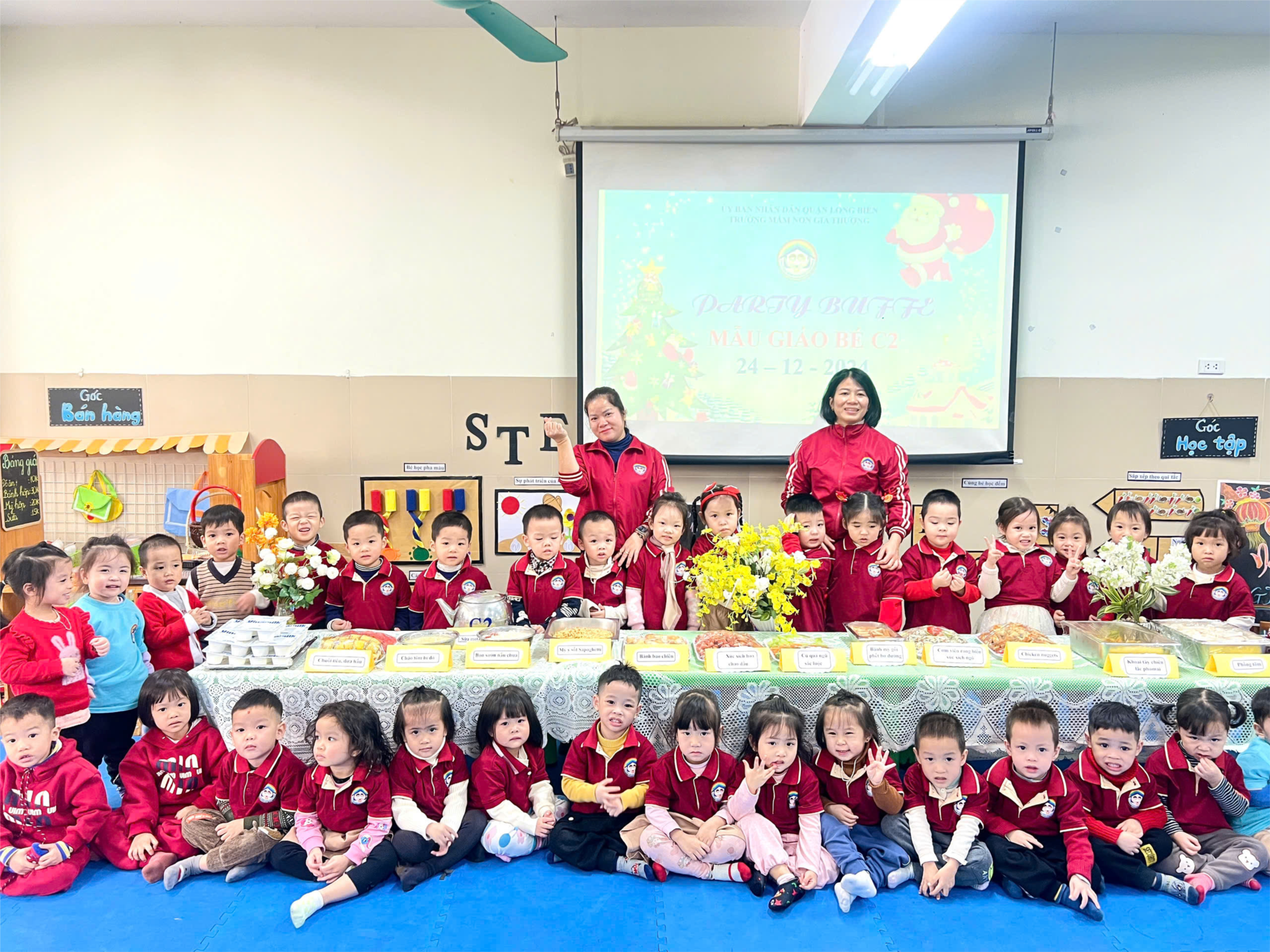 Tổ chức tiệc buffet cho trẻ là một trong những hoạt động thiết thực, hiệu quả nhằm tạo dựng cho trẻ những kỹ năng sống cần thiết ngay từ khi còn nhỏ. Dạy trẻ thói quen tự phục vụ, tự lựa chọn món ăn giúp trẻ thêm mạnh dạn, tự tin giao tiếp, ứng xử. Hơn nữa, tổ chức cho trẻ ăn buffet còn giúp trẻ giao lưu, trao đổi trò chuyện với nhau về các món ăn, cách ăn, cách sử dụng đồ ăn, tạo tiền đề cho sự phát triển của trẻ một cách toàn diện. Ngoài ra cô và trò lớp C2 còn cùng nhau dọn dẹp lớp, trang trí cây thông Noel, sắp xếp bàn tiệc nhỏ, bên cạnh đó các còn được tìm hiểu về ý nghĩa của ngày lễ giáng sinh, được gặp ông già Noel. Với ý nghĩa như vậy, trong những ngày cuối cùng của năm 2024 và chuẩn bị bước sang năm mới 2025, ngày 24 tháng 12 năm 2024 trường Mầm non Gia Thượng đã tổ chức tiệc buffet “Chào đón năm mới 2025”cho trẻ.